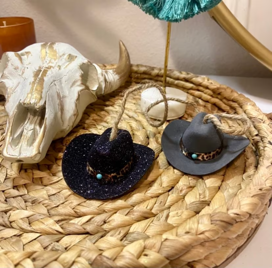 Charcoal and black cheetah with turquoise cowboy hat car charm